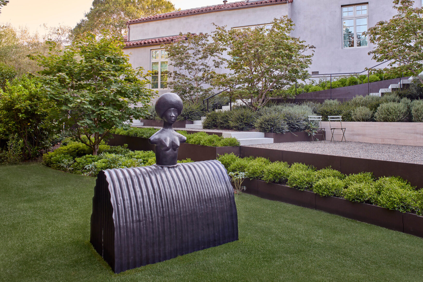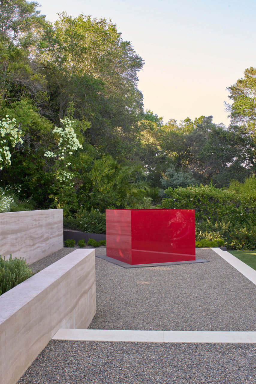 A contemplative outdoor gallery emerges from a previously underutilized corner of the property, where art and landscape are integrated at an intimate scale. Sculptural elements are revealed through a sequence of terraced planes, structured plantings, and rammed earth retaining walls that establish a measured spatial rhythm. The design accommodates both solitary exploration and social engagement, providing a refined setting in which art can be experienced as part of daily life.