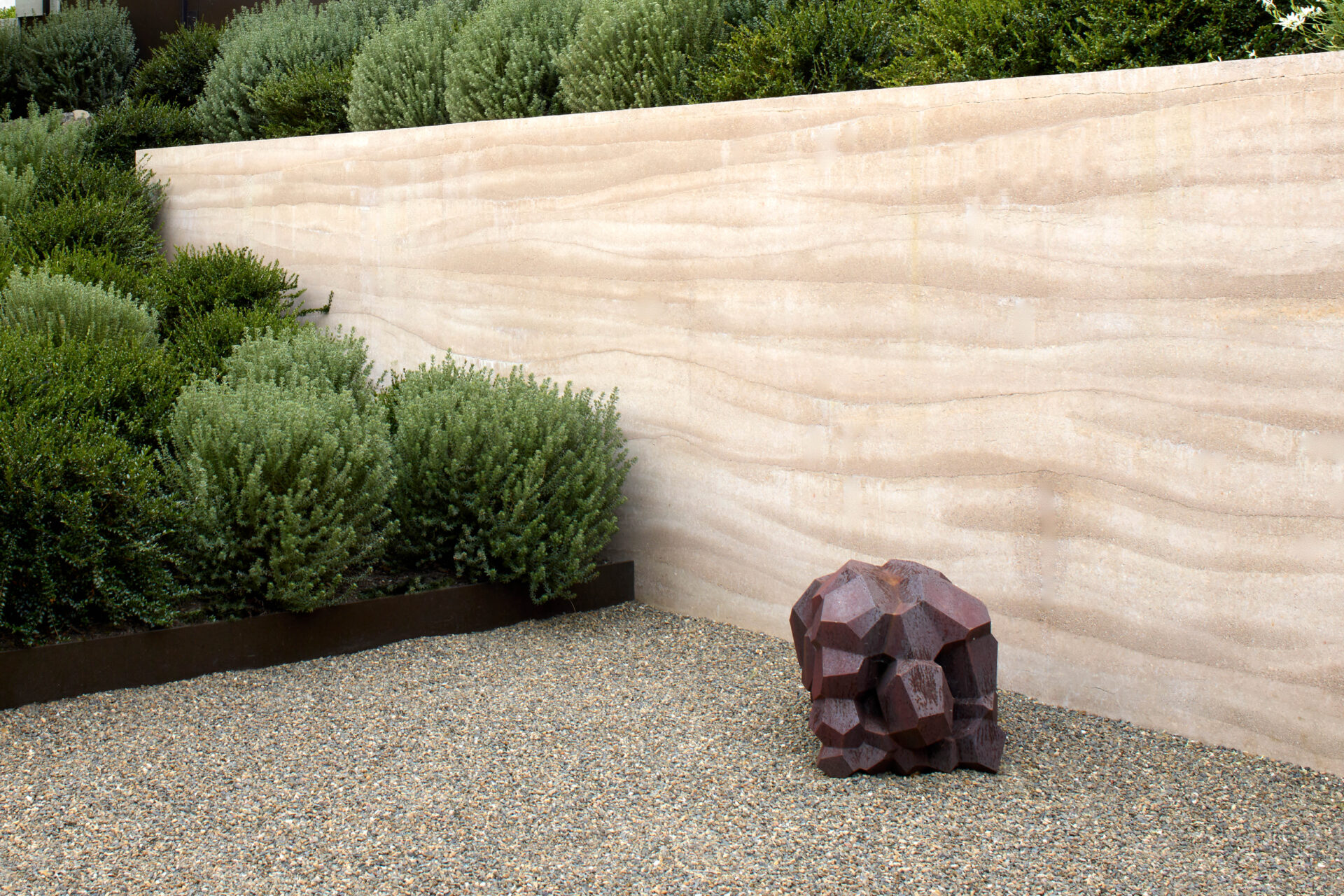 On the lower terrace, a compact cast iron sculpture anchors the space, its oxidized surface resonating with the warm mineral tones of the rammed earth backdrop. The figure’s compressed massing and angular geometry complement the robust quality of the hardscape. Adjacent plantings of Lonicera pileata and Westringia fruticosa provide a measured counterpoint—organic yet structured—reinforcing the dialogue between built and natural form.