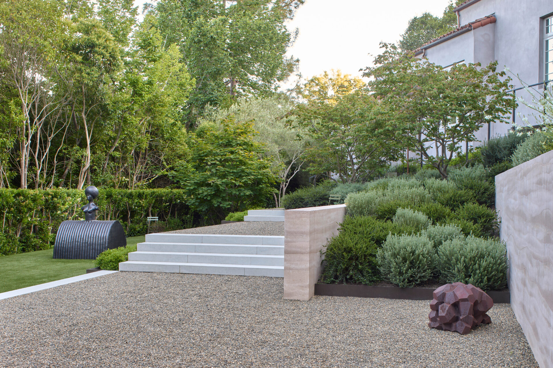 Collectively, the design transforms a steep slope into a calibrated landscape of layered perception. Rammed earth walls, sculpted vegetation, and gravel terraces operate not merely as supporting elements but as active spatial organizers that choreograph movement, pause, and visual engagement. Sculptures are seamlessly integrated within this framework, enriching the experiential depth of the site while maintaining its contemplative and enduring character.