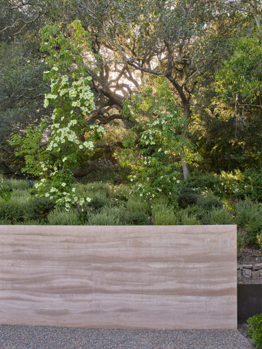 Addressing more than fifteen feet of grade change, a system of custom rammed earth walls defines a series of gravel plateaus and walkways that extend outward from the hillside. Limestone steps interconnect these levels, unifying the terrain into a coherent composition. The striated horizontal bands of the rammed earth invite movement and emphasize linear continuity across the site. Their rust-hued patina and undulating geometry convey a strong sense of material authenticity, evoking the stratified character of the surrounding earth. Seasonal planting, including Japanese maples, introduces vertical contrast and softness, echoing the rippling patterns articulated in the walls. The precise balance of tone, texture, and form was achieved through an iterative process of material testing and on-site mock-ups.